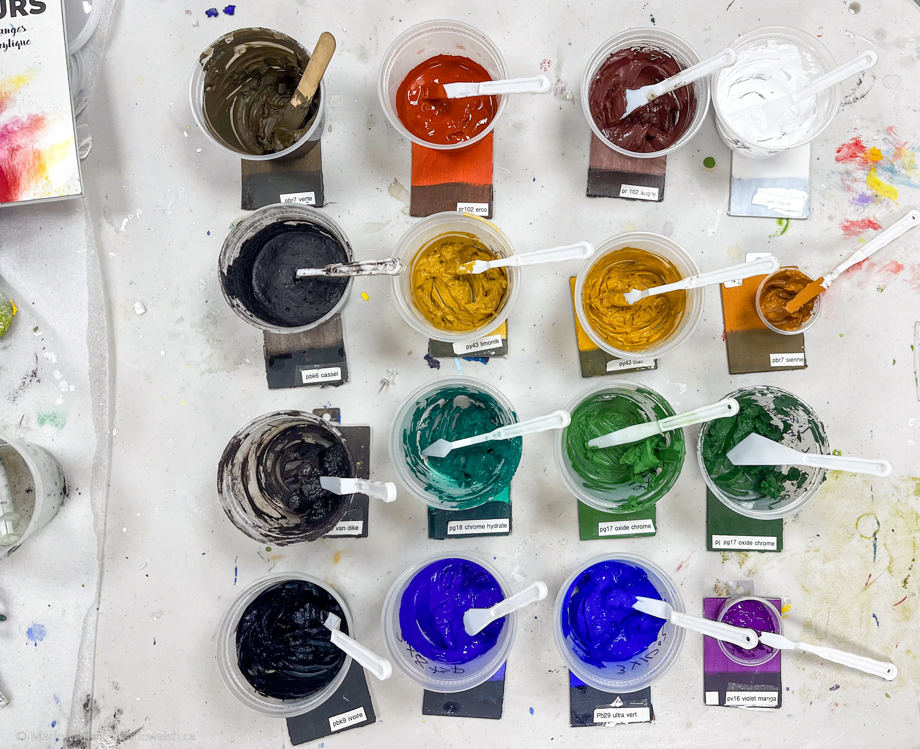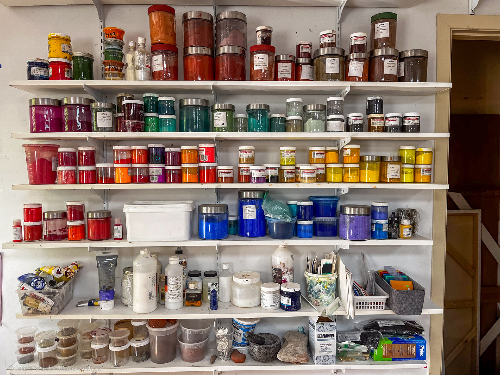 Cette bibliothèque permet d’observer concrètement le comportement des pigments en peinture : fabrication, texture, transparence, opacité et résultat final.