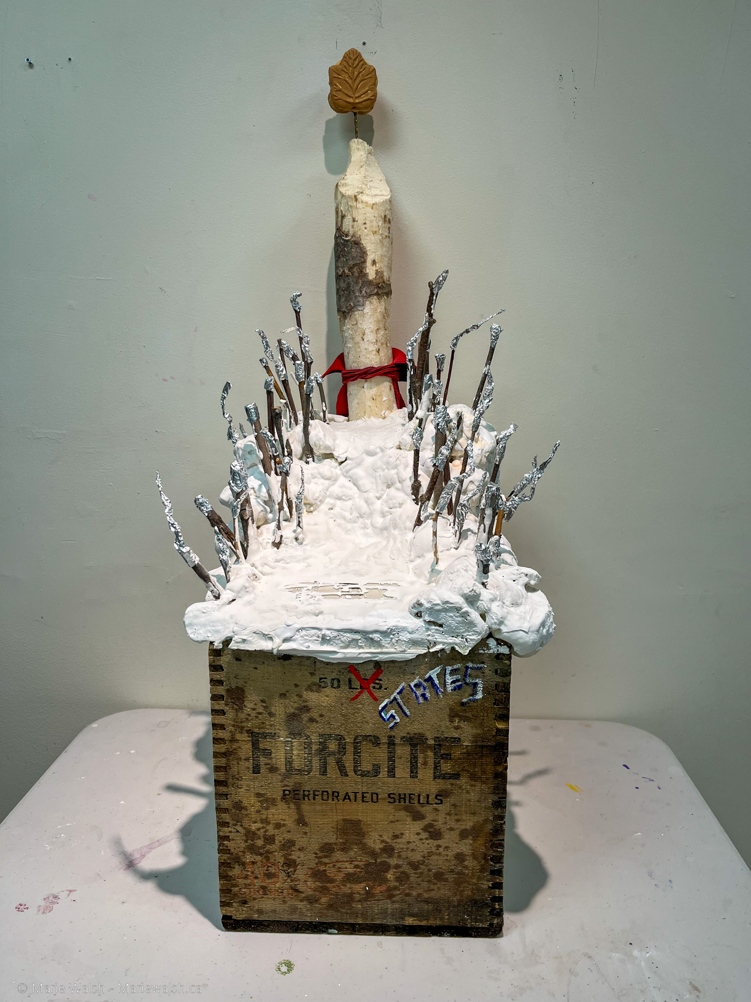 Au centre de l’installation, un bâton vertical et inébranlable émerge d’une véritable boîte de munitions canadienne datée de 1954, estampillée Forcite. Il symbolise la résilience du Canada, profondément enraciné dans son histoire et sa souveraineté.